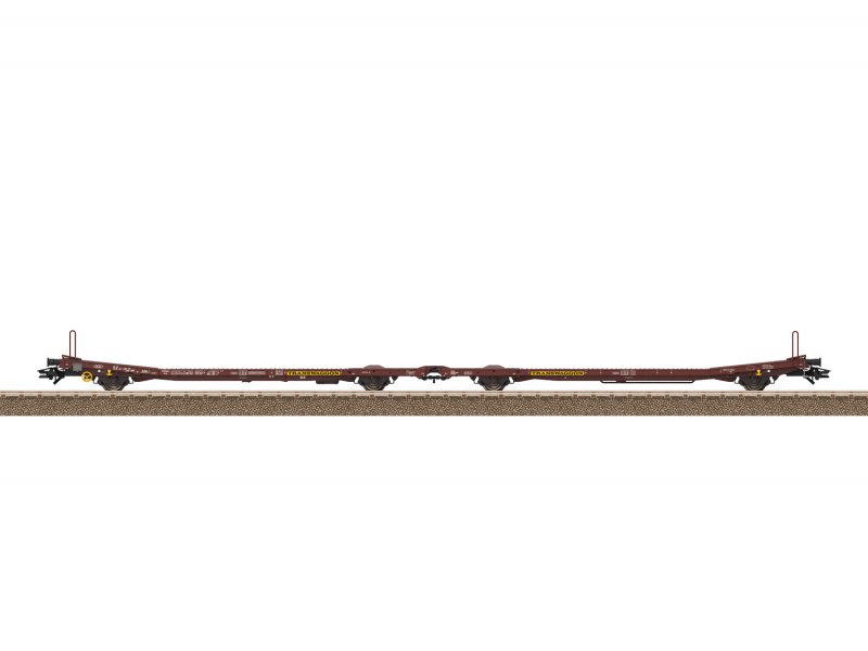 Beide Flachwagenhälften aus Metall. Viele separat angesetzte Details wie Bremsleitungen, Luftbehälter, Überfahrbleche, Tritte und Bremsgestänge. Pufferhöhe nach NEM. Kinematikgeführte, starre Schraubenkupplung zwischen den Wagenhälften. Haltekeile für die Wagenoberseite, Haltekeile für den Wagenboden und Bremsschläuche liegen als separat ansteckbare Teile bei.