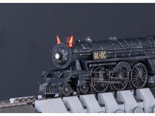 Mit Digital-Decoder und umfangreichen Licht- und Soundfunktionen. Geregelter Hochleistungsantrieb mit Schwungmasse im Kessel. Drei Achsen angetrieben. Haftreifen. Lokomotive und Tender weitgehend aus Metall. Serienmäßig eingebauter Raucheinsatz, mit geschwindigkeitsabhängigem, dynamischem Rauchausstoß, digital schaltbar. Frontscheinwerfer mittig auf der Rauchkammertür der Lok und eine Lampe an der Tenderrückseite konventionell in Betrieb, digital schaltbar. Die Beleuchtung des Frontscheinwerfers kann auf rot umgeschaltet werden. Die AC/DC typischen Teufelshörner sind beleuchtet und können digital zugeschaltet werden. Führerstandsbeleuchtung und Feuerbüchsenflackern digital schaltbar. Beleuchtung des Tender-Durchgangs digital schaltbar. Beleuchtung mit wartungsfreien warmweißen und roten Leuchtdioden (LED). Verstellbare Kurzkupplung mit Kinematik zwischen Lok und Tender. Am Tender kinematikgeführte Kurzkupplung mit NEM-Schacht. Pufferhöhe an Lok und Tender nach NEM. Bremsschläuche, Schraubenkupplungsimitationen und geschlossene Zylinderdeckel liegen bei.