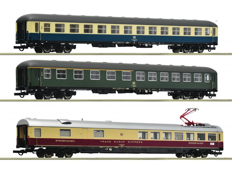 ¦ Wagen im Zustand Mitte der siebziger Jahre ¦ Erstgebauter ABüm 225 ohne Dampfheizung (31-70 001) ¦ Erstgebauter WRümz 135 mit Stromabnehmer und TEE-Schriftzug (88-73 301) ¦ Wagenlauf Hamburg – Genf ¦ Fein detaillierte Drehgestelle