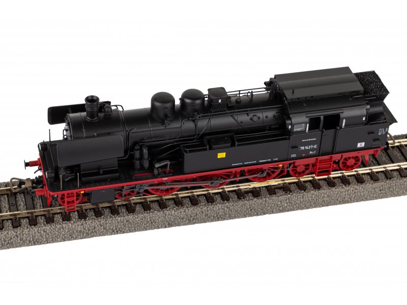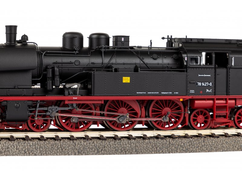 Die BR 78 von PIKO mit vorbildgetreuer Gestaltung und Beschriftung der DR in Epoche IV. Nahezu alle Leitungen wurden freistehend ausgeführt, Führerhaus, Wasserkästen und Rauchkammer zieren feinste Nachbildungen der Nietköpfe. Für ausgezeichnete Fahreigenschaften sorgt der fünfpolige PIKO-Motor mit Schwungmasse. Zusatzgewichte im Kessel und zwei Haftreifen sorgen für eine hohe Zugkraft. Die Soundvariante verfügt ab Werk über einen PIKO Sound-Decoder inkl. Lautsprecher sowie einen integrierten Rauchsatz. Für authentische Betriebsstimmung sorgt die fahrtrichtungsabhängige Beleuchtung in LED-Ausführung.