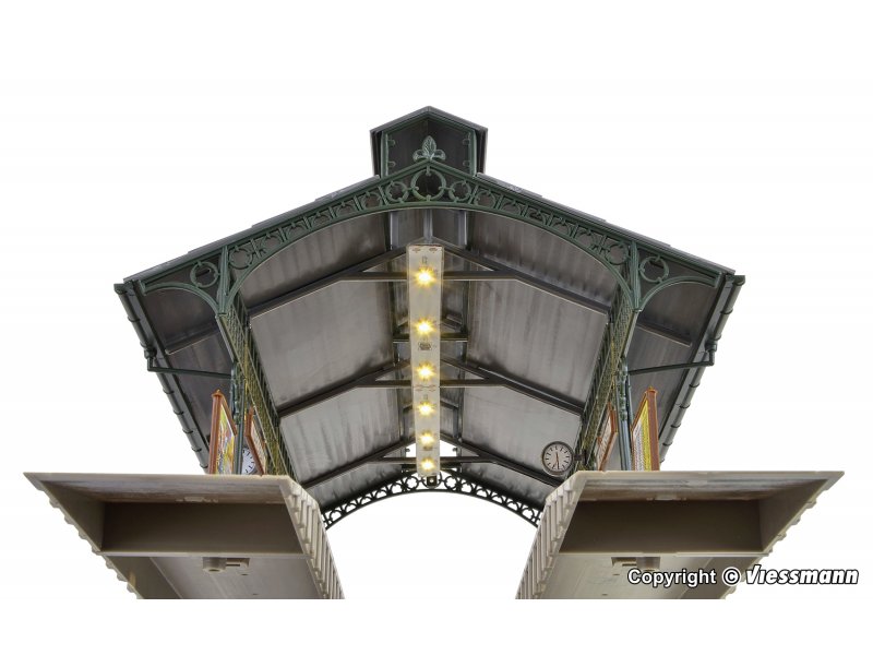 6 warmweiße LEDs unter dem Dach leuchten den Wartebereich gleichmäßig aus. Mit einem 2. Bausatz ist die Halle verlängerbar. Diese Bahnsteighalle ist für alle gängigen Gleissysteme geeignet.
