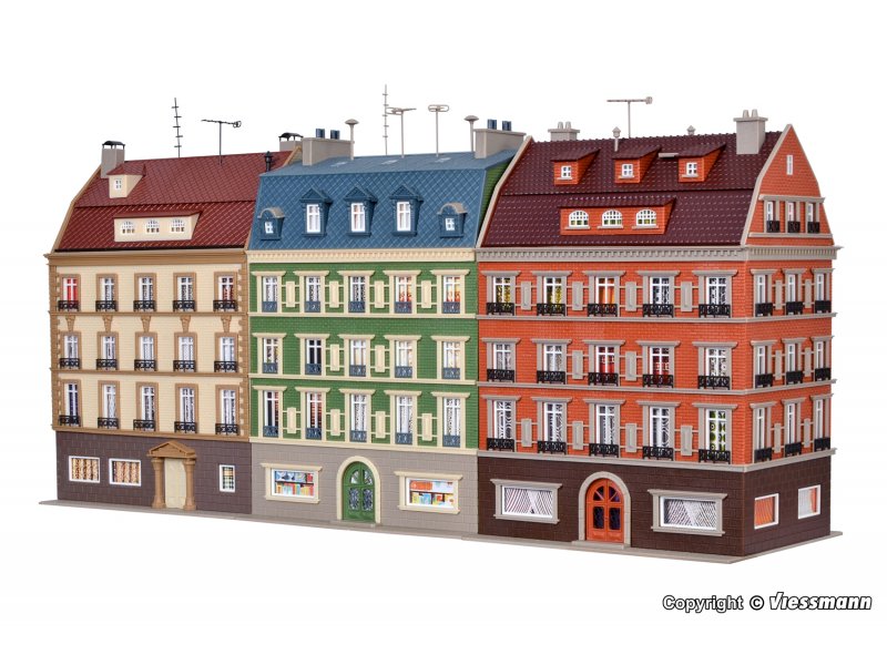 Mit diesem Häuserblock können Sie einen ganzen Straßenzug gestalten. Die Gebäude sind mit vielen Details ausgestattet, z. B. Eisengitterverzierungen, zierlichen Balkonen, Dachterrassen und vielem mehr.