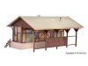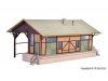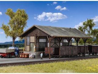 Bei diesem Schuppen ist der Gleisanschluss überdacht. So können die Güter im Trockenen ein- und ausgeladen werden. Die Holz-Backsteinstruktur gibt dem Gebäude ein interessantes Äußeres. Durch Glasbausteine fällt Licht in den Innenraum.