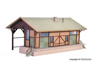 Bei diesem Schuppen ist der Gleisanschluss überdacht. So können die Güter im Trockenen ein- und ausgeladen werden. Die Holz-Backsteinstruktur gibt dem Gebäude ein interessantes Äußeres. Durch Glasbausteine fällt Licht in den Innenraum.