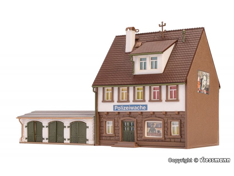 Das zweistöckige Gebäude beherbergt die Polizeiwache einer Kleinstadt. Im Garagenanbau gibt es 3 Stellplätze für die Einsatzfahrzeuge.